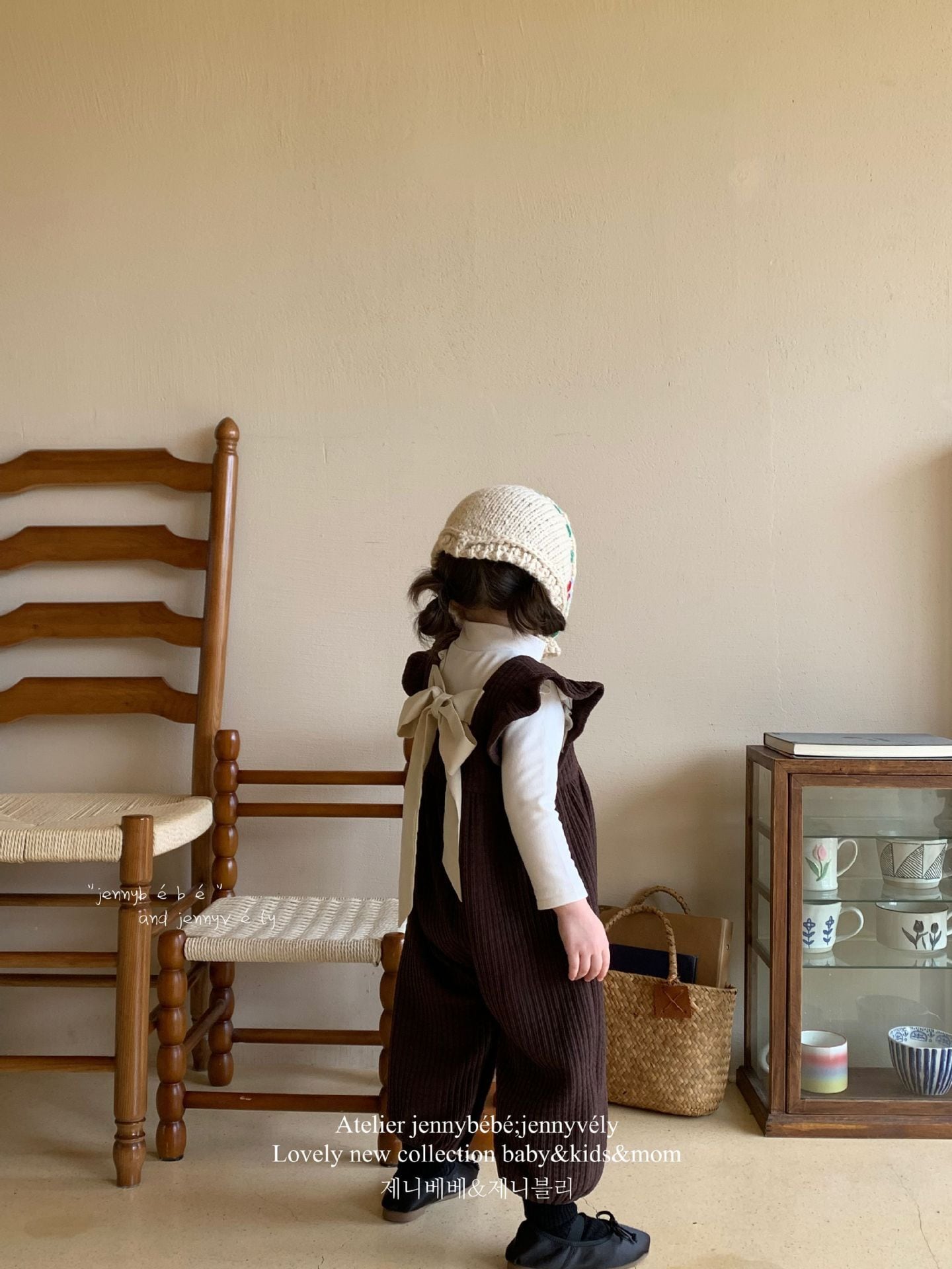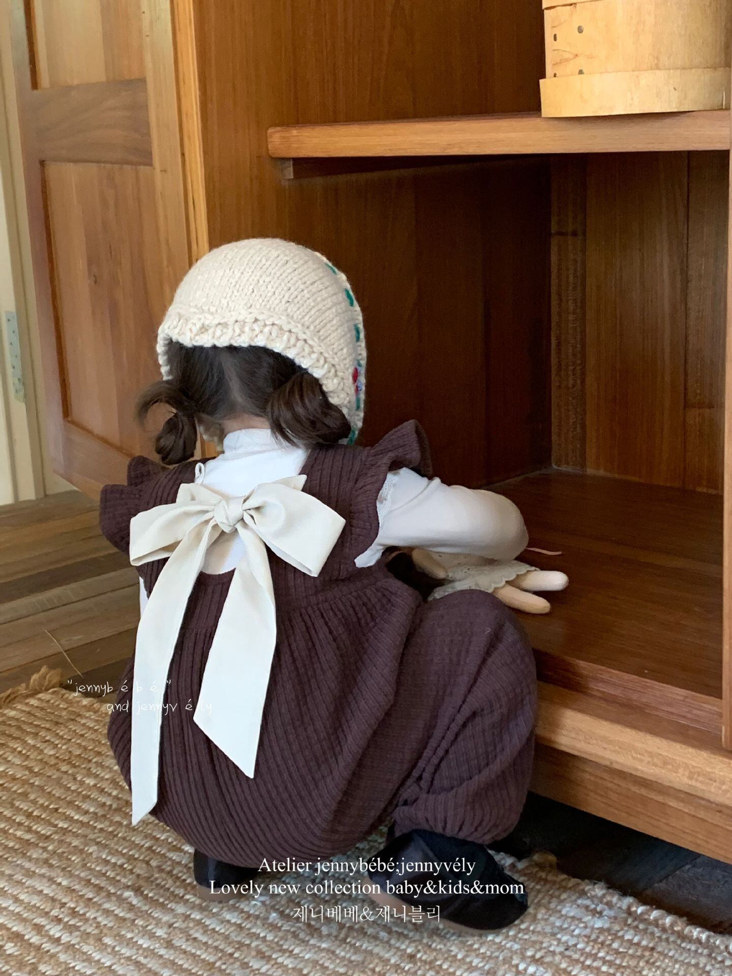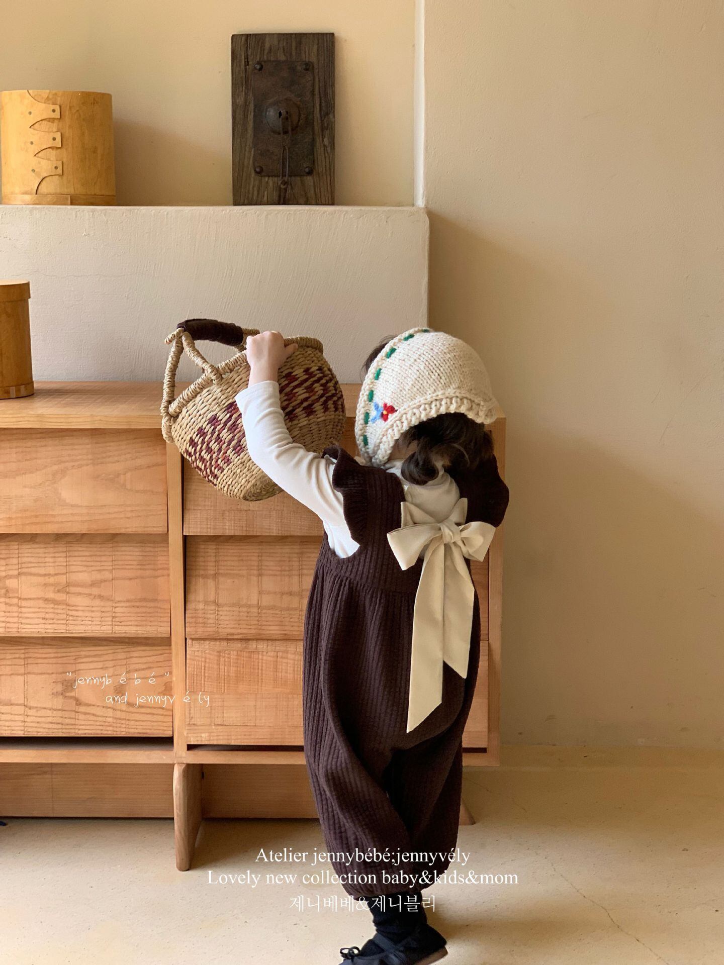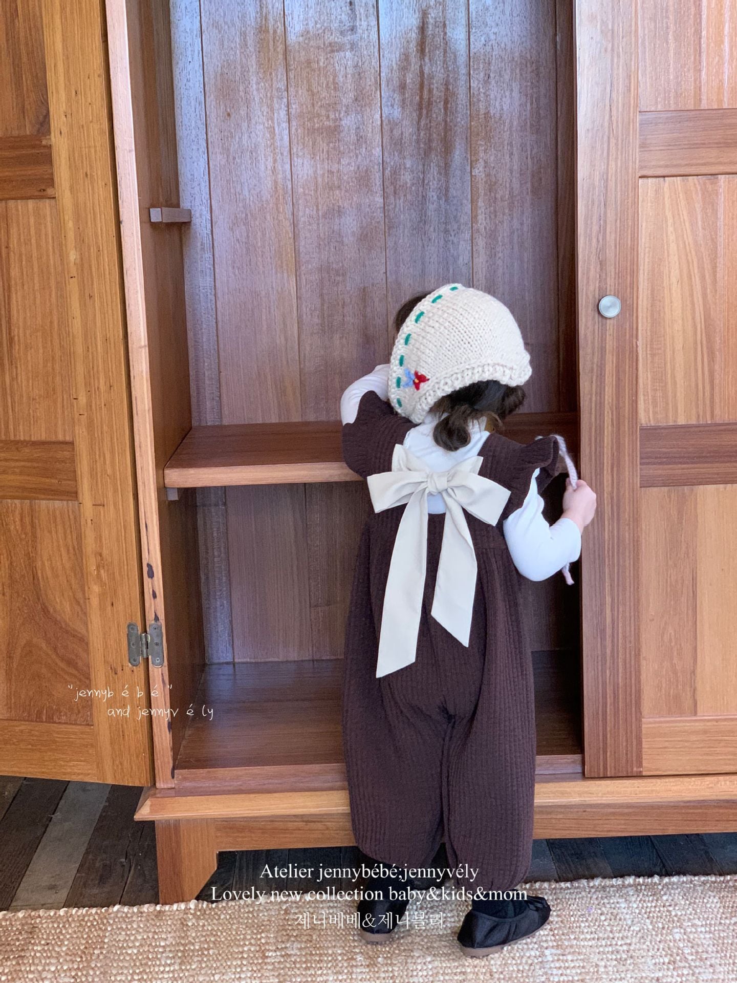 背中の大きなリボンがポイントのオーバーオール。 コーデュロイ生地なので、秋〜冬にかけて大活躍のアイテムです。 前から見ても、後ろから見ても360度可愛らしい1枚です。